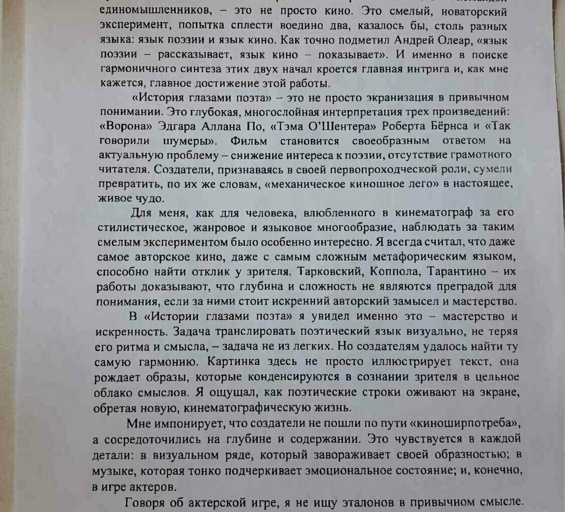 Многие зрители на серии показов и творческих встреч отмечали, что фильм стал для них не просто развлечением, а настоящим духовным опытом. Он побудил к саморефлексии, к переосмыслению собственных жизненных путей и ценностей. В эпоху стремительного потребления информации и поверхностных впечатлений, «История глазами поэта» предложила нечто иное – возможность замедлиться, вслушаться в себя и в мир вокруг, увидеть красоту в деталях и глубину в простых вещах. После обсуждения стало ясно, что фильм вызвал широкий спектр интерпретаций. Каждый зритель находил в нем что-то свое, созвучное собственному опыту и мироощущению. Это свидетельствовало о многослойности произведения и его способности резонировать с разными людьми на разных уровнях. Поэтическая форма, которая могла показаться сложной на первый взгляд, на деле оказалась универсальным языком, способным говорить с сердцем каждого.