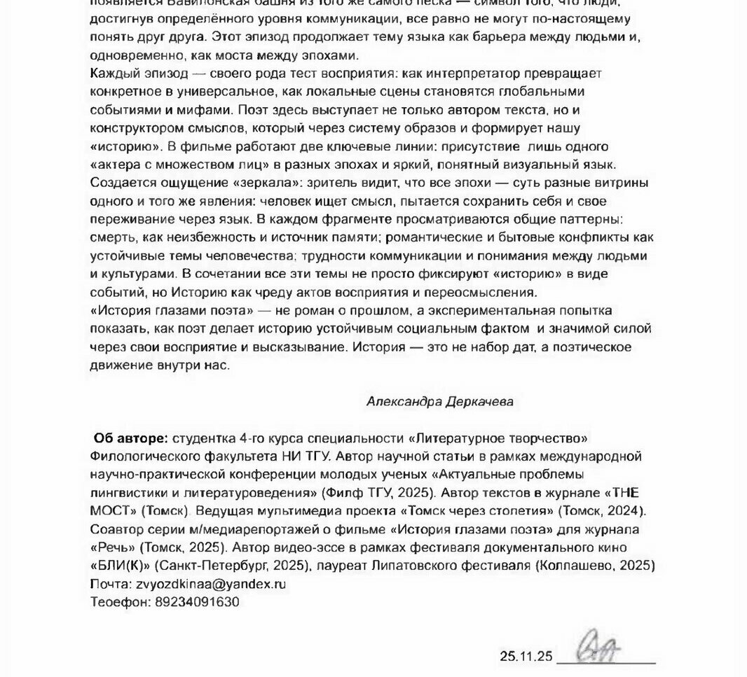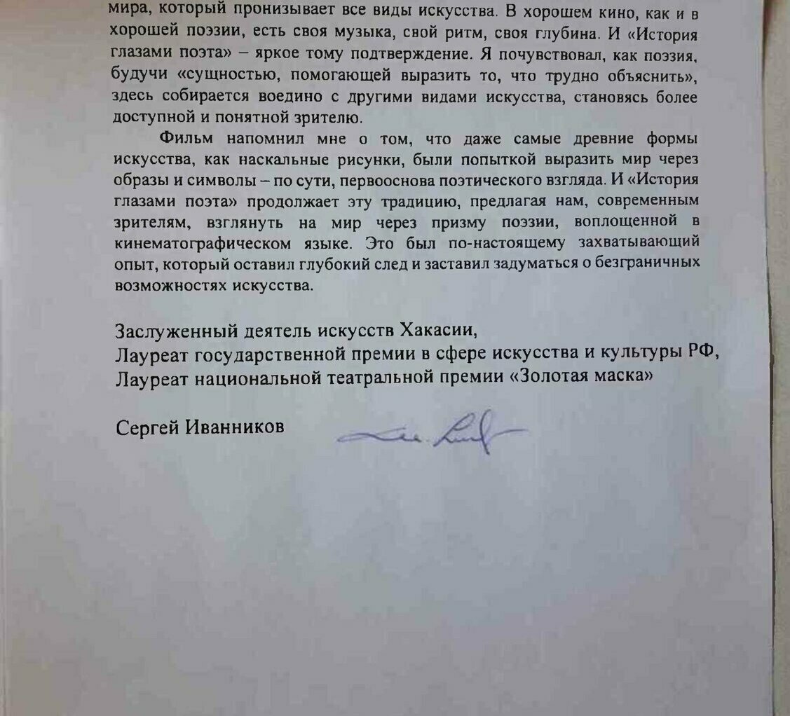 Покидая зал, томичи уносили с собой не просто воспоминания о просмотренном фильме, а нечто большее – ощущение причастности к важному разговору о человеке и времени, о вечных ценностях и о той неуловимой материи, что способна побеждать забвение. «История глазами поэта» стала для Томска не просто кинопоказом, а настоящим событием, оставившим глубокий след в душах зрителей.