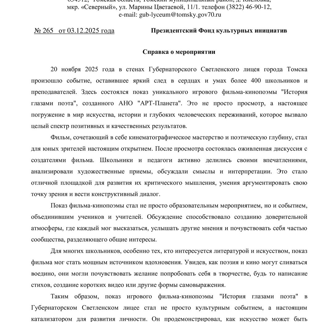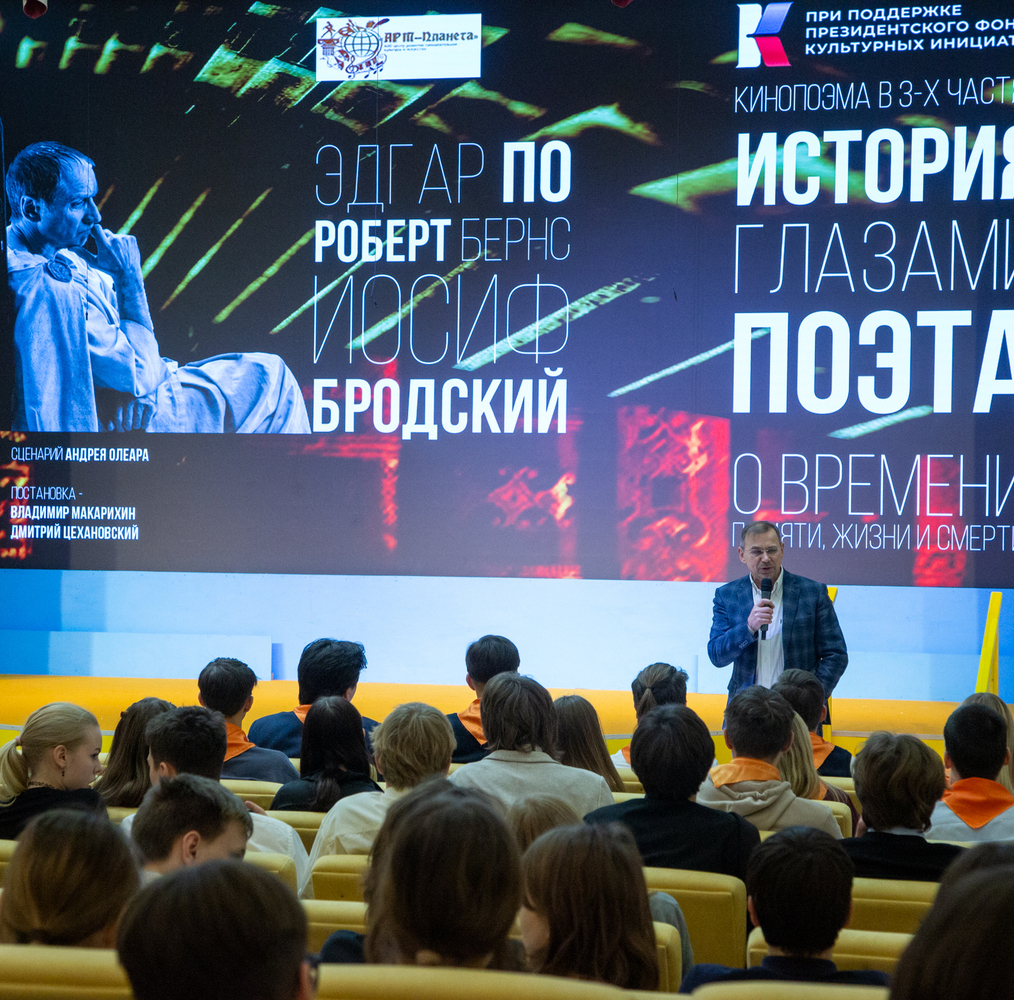 26 ноября 2025 года состоялась творческая встреча с создателями игрового фильма-кинопоэмы «ИСТОРИЯ ГЛАЗАМИ ПОЭТА» в Губернаторском Светленском лицее: фоторепортаж