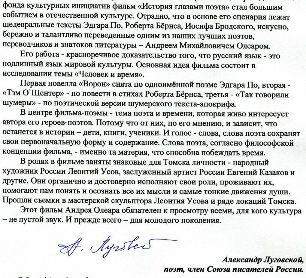Андрей Олеар: «Проект получил поддержку Президентского фонда культурных инициатив. И, в связи с этим, нас (тех, кто его придумал) постоянно спрашивают: “Если Вы получили грант на создание русского кино, то причём здесь западная классика – тексты Эдгара По, Роберта Бёрнса, английский Бродский?” И тут я не устаю повторять, что все наши киноработы транслируют очень правильную мысль о том, что русский язык — это язык мировой культуры. Русская культура (а поэзия в особенности) прекрасна тем, что обладает огромным спектром возможностей присвоения чужих художественных достижений и трансформации этих достижений в кровь и плоть отечественной культуры и литературы».