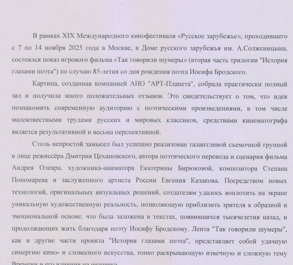 С 7 по 14 ноября 2025 года в г. Москве состоялся XIX Международный кинофестиваль «Русское зарубежье».