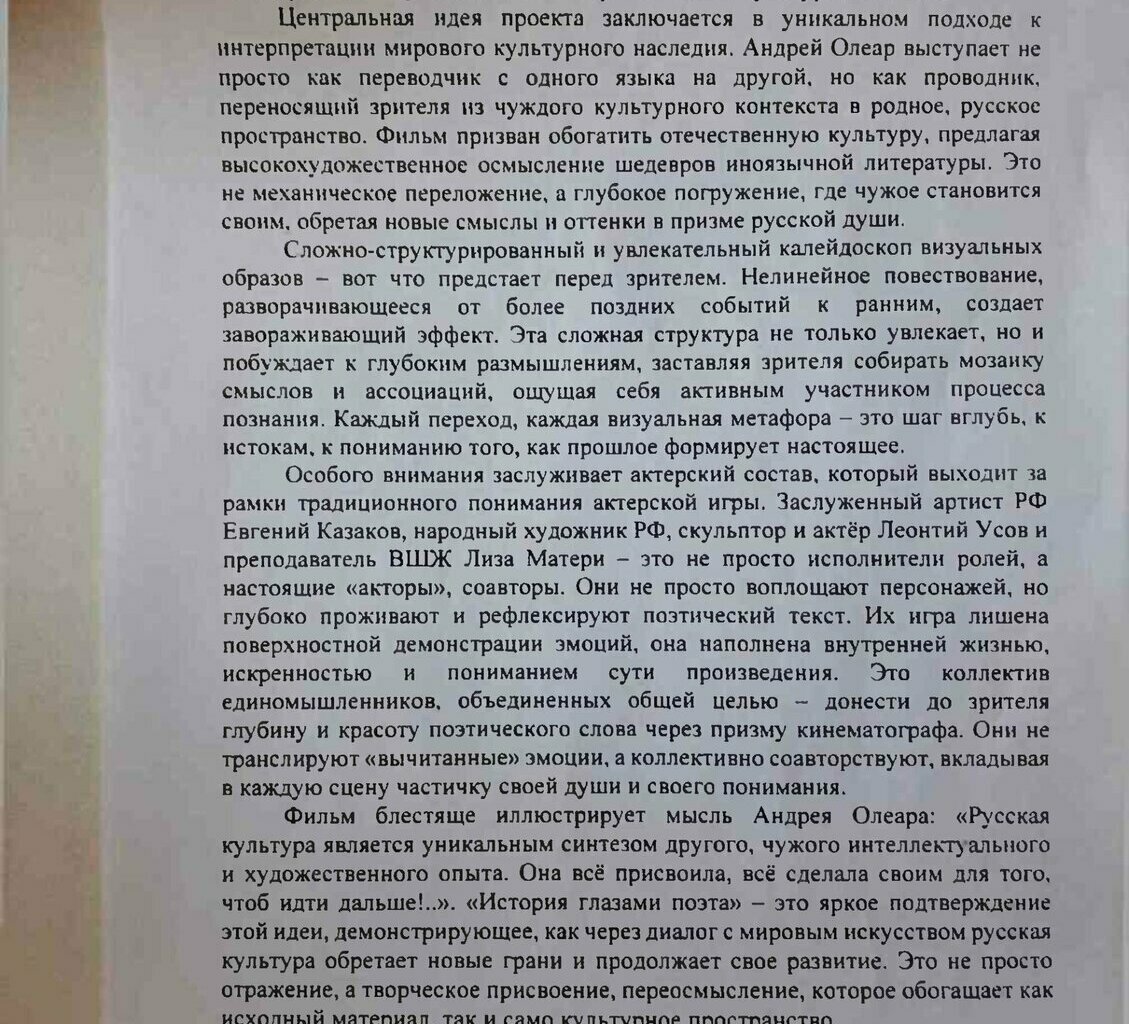 Кинопроект придумал Андрей Олеар, только что ставший лауреатом премии ТГУ 2024 г. «За высокие достижения в сфере литературы, искусства и культуры» за серию художественных киноработ «История глазами поэта».