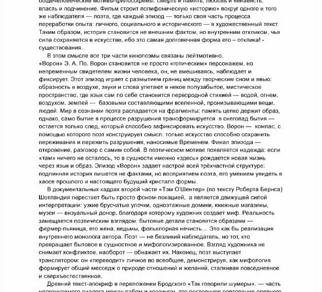 У меня сложные отношения с видеоартом. И разобраться в них помог фильм «История глазами поэта» – визуализация Владимиром Макарихиным и Дмитрием Цехановским созданных томским поэтом и переводчиком Андреем Олеаром переложений «Ворона» Эдгара По, поэмы «Тэм О'Шентер» Роберта Бернса и версифицированного Иосифом Бродским на английском древнешумерского текста, представляющего собой диалог хозяина и раба, – который в сегодняшней реальности весьма напоминает философские беседы с искусственным интеллектом.