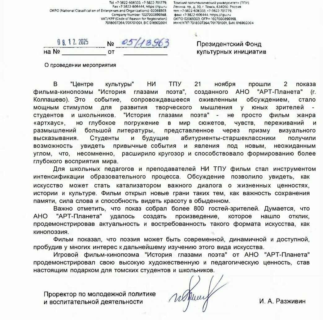 После показов и обсуждения в "Центре культуры" НИ ТПУ игрового фильма-кинопоэмы "История глазами поэта" старшеклассники получили возможность увидеть привычные события и явления под новым, неожиданным углом, что, несомненно, расширило их кругозор и способствовало формированию более тонкого восприятия мира. Для педагогов фильм стал ценным инструментом для обогащения образовательного процесса. Обсуждение после показов позволило им увидеть, как искусство может стать катализатором для диалога о важных жизненных ценностях, истории и культуре. Фильм открыл новые грани для обсуждения тем, как важность сохранения памяти, сила слова и способность видеть красоту в обыденном.