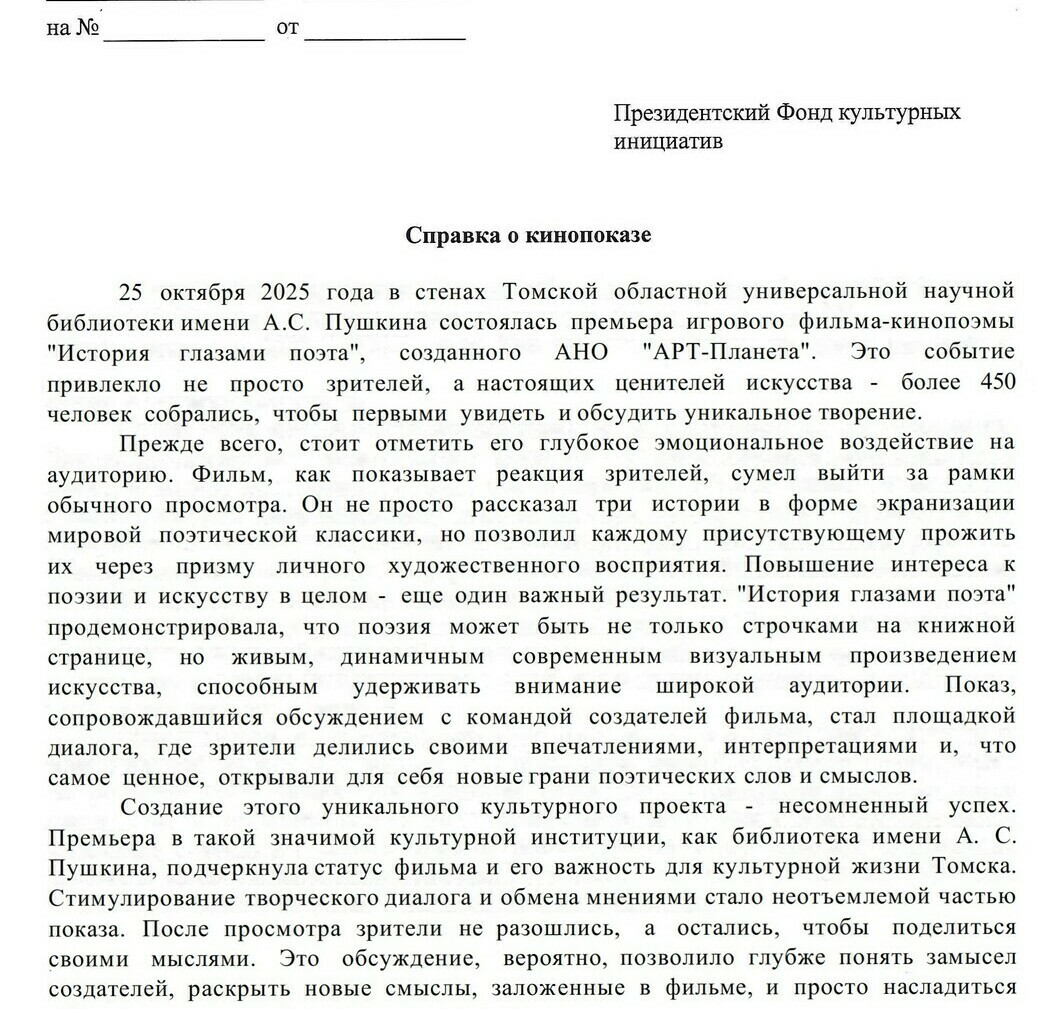 Компания АНО АРТ-Планета представила кинопроект "История глазами поэта" 25.10.25 в Театральном зале Томской областной библиотеки им. А.С. Пушкина.