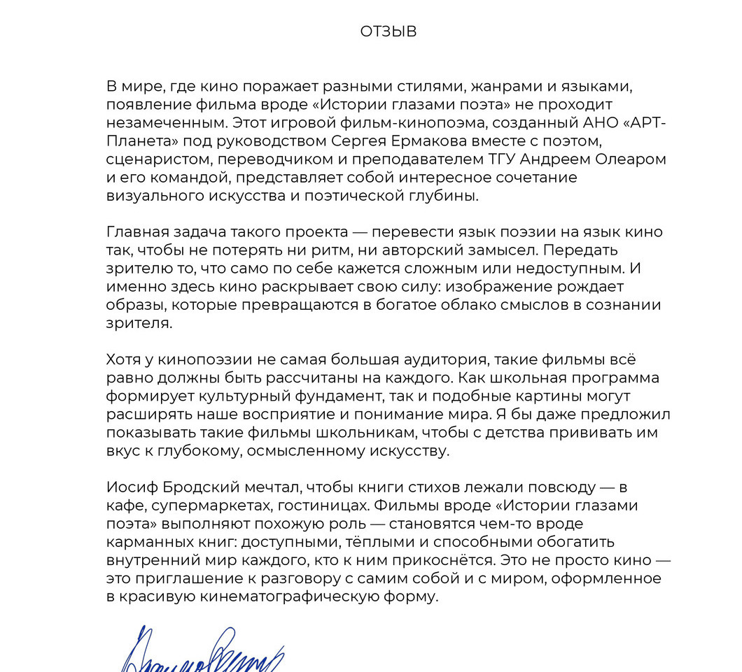 Совместно с партнёром АНО "АРТ-Планета" поэтом, сценаристом, переводчиком, преподавателем ТГУ Андреем Олеаром и его командой единомышленников, мы приступаем к созданию игрового фильма-кинопоэмы «ИСТОРИЯ ГЛАЗАМИ ПОЭТА».